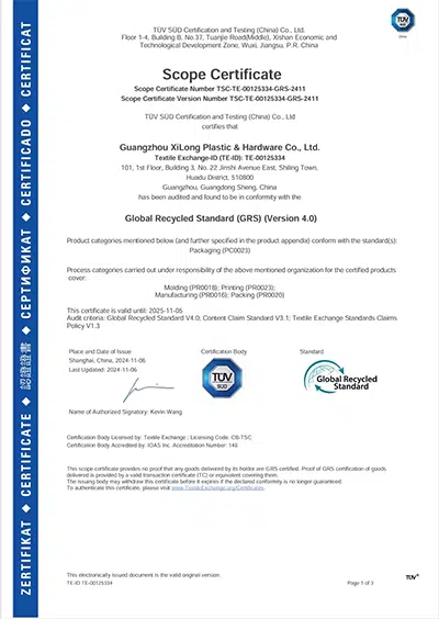 GRS is a full product standard to verify and track recycled raw materials through the supply chain. It also includes processing criteria to prevent the use of potentially hazardous chemicals, and verifies positive social or environmental production at the facilities.
