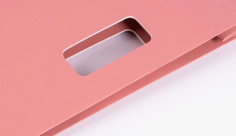Cut-out made with a custom die for a cost effective and unique handle bag handle option.